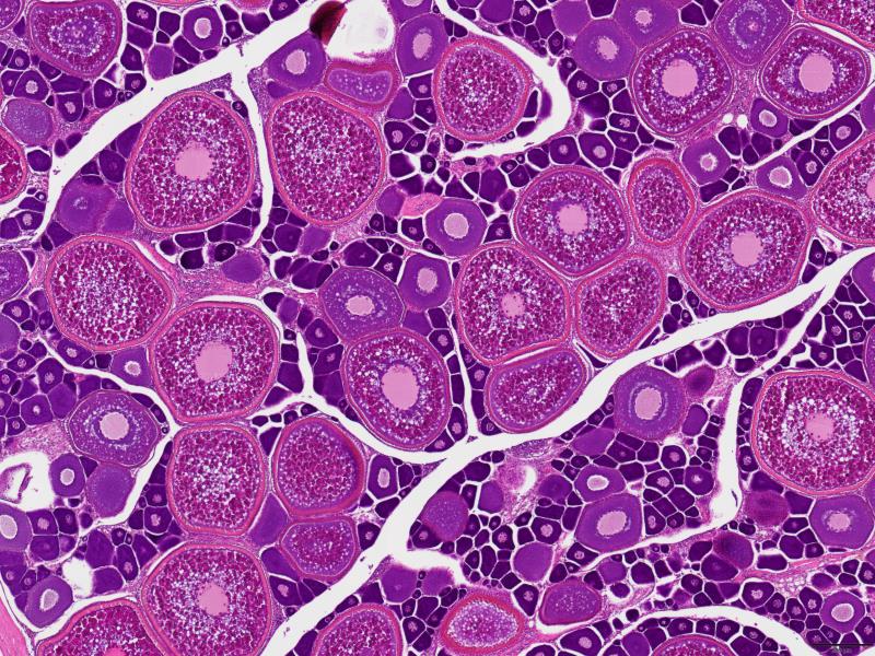↓カツオの生殖腺切片(卵の熟度判定を行います)