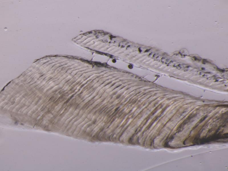 ↓コイ耳石(星状石)の切断切片、きれいな輪紋(年輪)が見えます