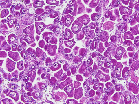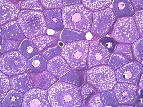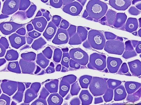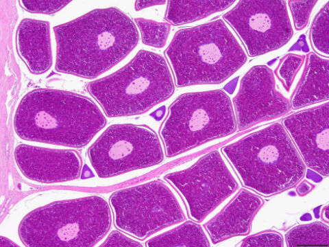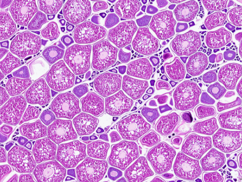 6~8μmの厚さの切片標本を切り出し、エオシン・ヘマトキシリン二重染色をおこないます。ご要望があれば、すべての標本の写真撮影をおこない成熟段階を標記いたします。成熟度の判定が目的でしたら、ホルマリン固定の状態でお送り頂ければ結構です。