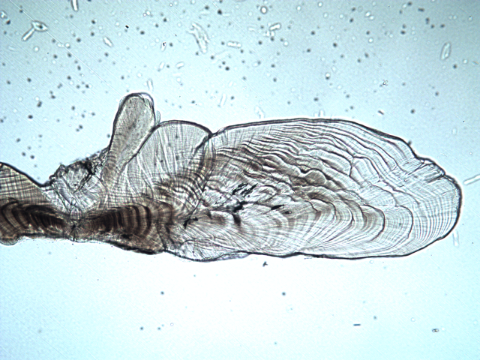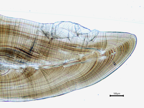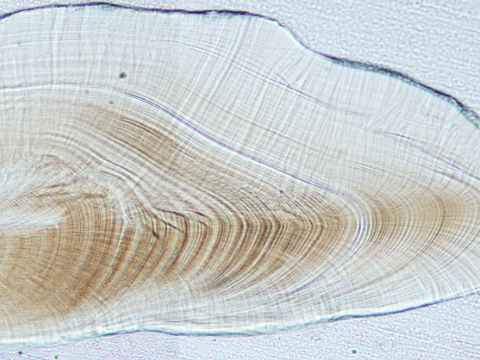 遊泳性の高い魚類は、魚体の大きさに比べ非常に耳石が小さい傾向に標本作製が困難です。