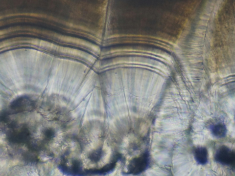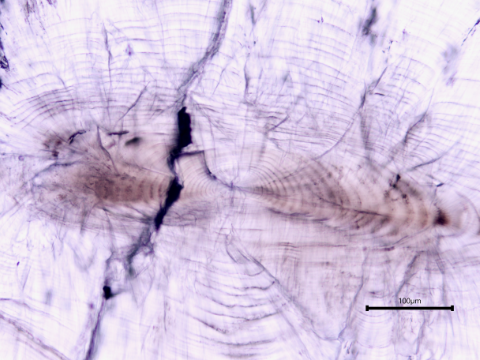 通常の研磨標本では輪紋観察が困難であるため、両側から研磨した薄片標本を作成します。 -