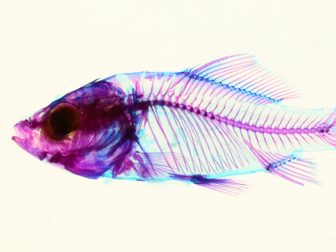 特殊な薬品を使い、工程を経ることにより、筋肉を透明にし、骨格の状態を解剖することなく観察することが出来ます。