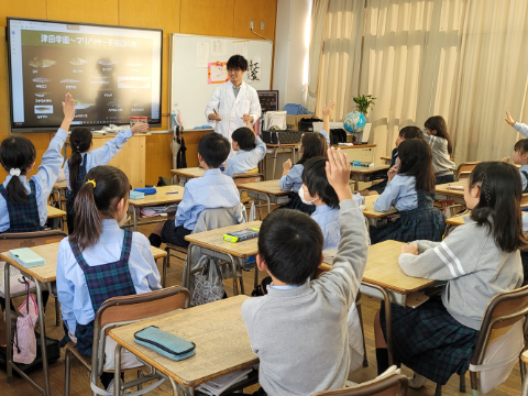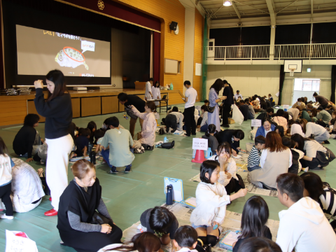 近くの七和小学校では毎年文化祭の時に体育館を利用して、たくさんの生徒にチリメンジャコを利用した魚類の分類を体験してもらっています。